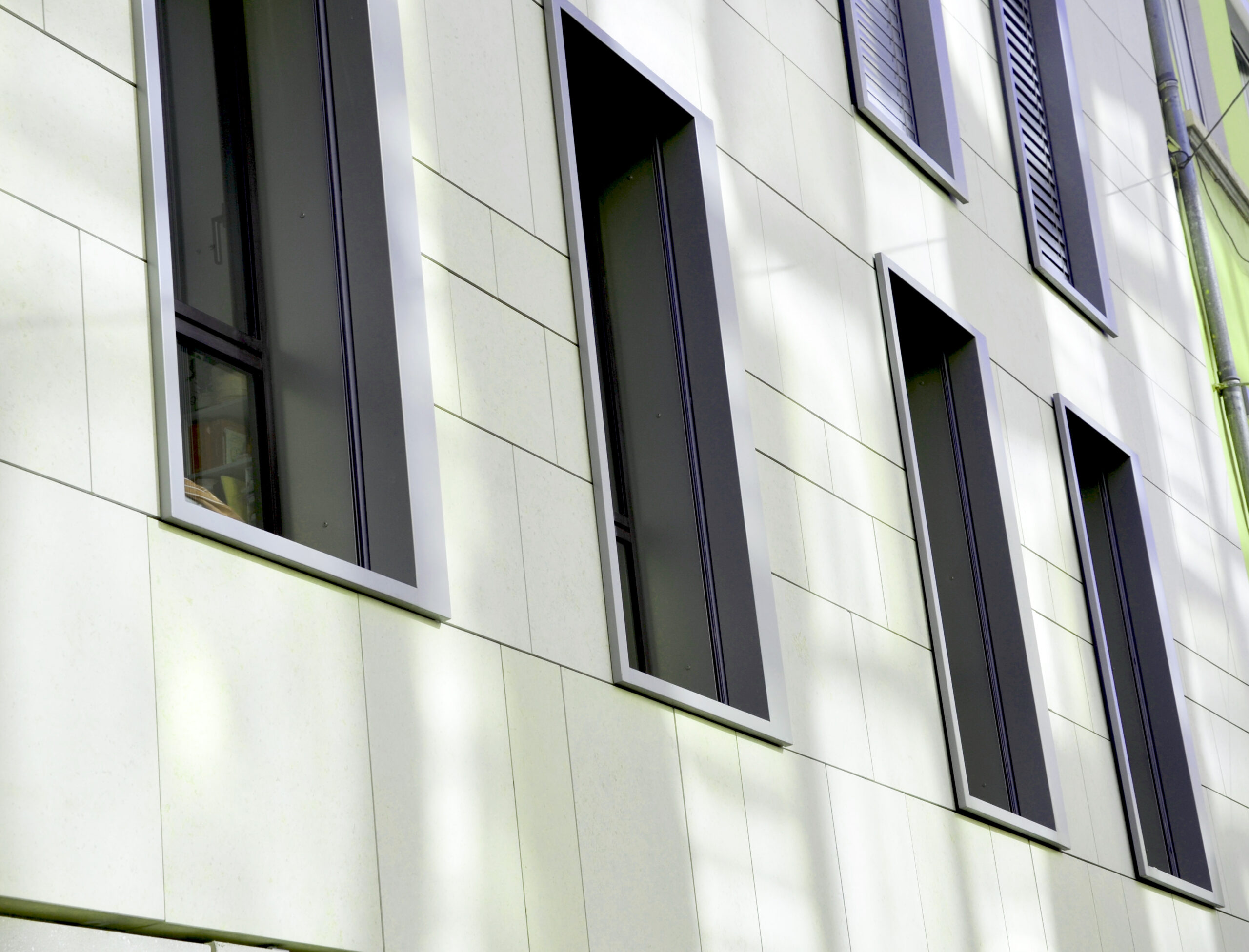 S’intègre avec tous types de bardages : bois, métal, béton, composite, minéral, ITE, pierre agrafée.